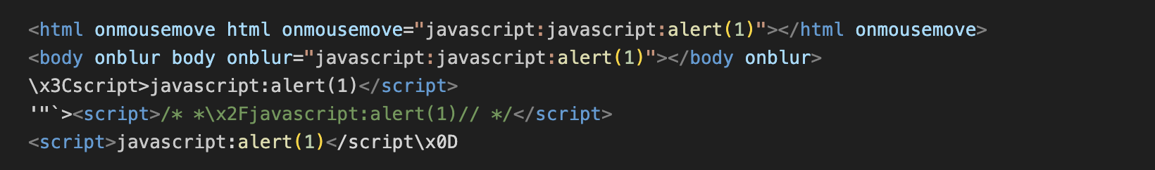 For this test, I picked selected XSS payloads from the list at https://github.com/payloadbox/xss-payload-list such as: